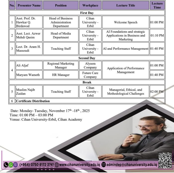 Cihan University–Erbil, Department of Business Administration cordially invites you to the International Workshop on “AI Foundations and Strategic Applications in Business and Marketing” ARTIFICIAL INTELLIGENCE Business and Marketing INTERNATIONAL WORKSHOP …