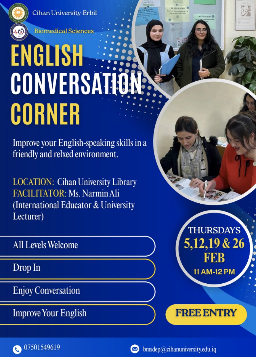 The Biomedical Sciences Department at Cihan University–Erbil is pleased to announce the English Conversation Corner, an interactive initiative designed to enhance English-speaking skills in a friendly and relaxed academic environment. This event aims to support students in improving their conversational English through open discussions, guided activities, and real-life communication practice. The sessions are suitable for all proficiency levels, encouraging participants to build confidence, expand vocabulary, and enjoy meaningful conversations in English. The sessions will be facilitated by Ms. Narmin Ali, an International Educator and University Lecturer, who brings extensive experience in language education and academic communication.