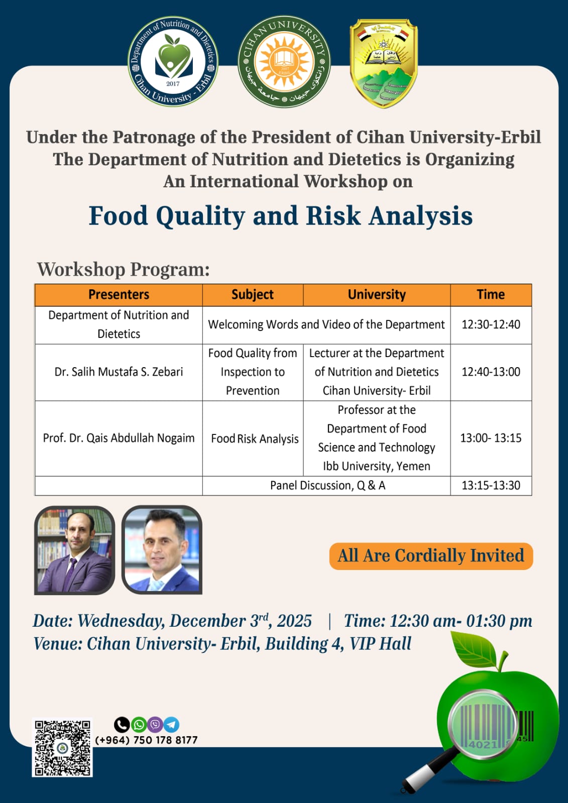 Under the Patronage of the President of Cihan University- Erbil The Department of Nutrition and Dietetics is Organizing An International Workshop on Food Quality and Risk Analysis.