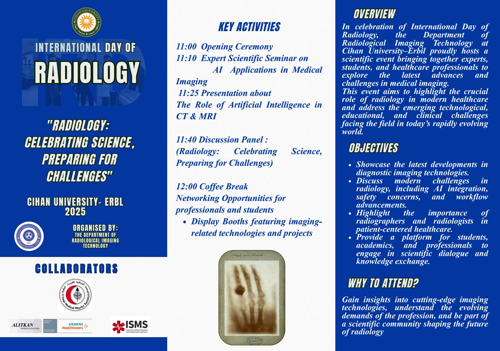 In celebration of International Day of Radiology, the Department of Radiological Imaging Technologies at Cihan University–Erbil proudly hosts a scientific event bringing together experts, students, and healthcare professionals to explore the latest advances and challenges in medical imaging.